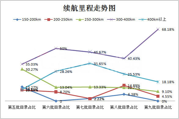 其中,在每批推薦目錄中占比最多的是續航里程在300-400km范圍內的車型,其占比由第5批的35.03%提升至第9批的68.18%,其次是400公里以上的車型;而200公里以下的車型由13.27%下降至0。