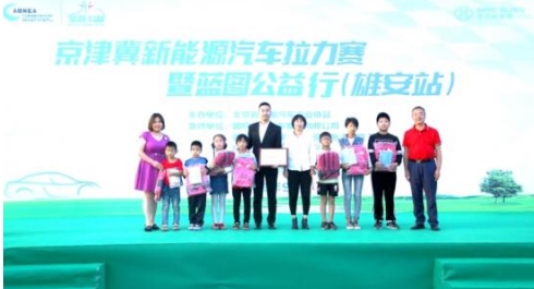 【眾嘉賓和劉莊小學(xué)師生一起為京津冀新能源汽車?yán)愻咚{(lán)圖公益行雄安站點(diǎn)贊】