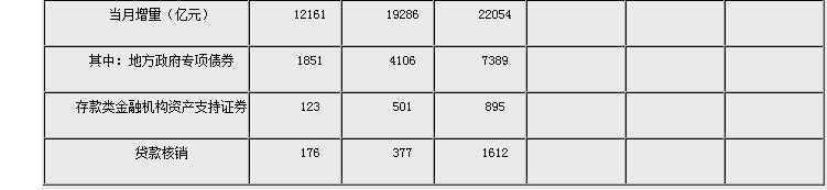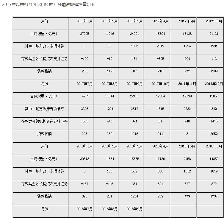 注2:2018年7月起,人民銀行完善社會(huì)融資規(guī)模統(tǒng)計(jì)方法,將“存款類金融機(jī)構(gòu)資產(chǎn)支持證券”和“貸款核銷”納入社會(huì)融資規(guī)模統(tǒng)計(jì),在“其他融資”項(xiàng)下反映。