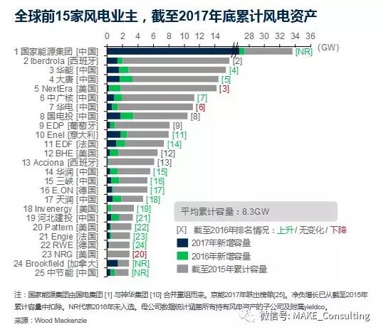 Wood Mackenzie電力與可再生能源事業部(以下簡稱WoodMac)近期發布《2018年全球風電資產所有權報告》。報告顯示,根據截至2017年底累計風電裝機容量排名的全球前25家風電業主中,11家持有風電資產的中國業主躋身榜單,其中由國電集團與神華集團合并重組后的國家能源集團以34GW累積風電資產傲居榜首。