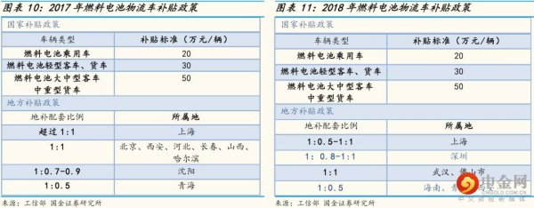 參考2018年11月發(fā)布的第21批《免征車輛購置稅的新能源汽車車型目錄》,在107款純電動(dòng)貨車和專用車中,續(xù)航里程100-200km車型占比11%,200-300km車型占比63%,300-400km車型占比24%,400km以上車型占比2%,純電動(dòng)物流車通過提高帶電量提升續(xù)航,但滿載時(shí)車輛續(xù)航里程會(huì)打折。由于燃料電池處于發(fā)展初期,目錄上車型款數(shù)較少,我們參考第20和21批《免征車輛購置稅的新能源汽車車型目錄》,兩批目錄共有7款燃料電池廂式專用車,續(xù)航里程都在350km以上,而且燃料電池物流車可以通過增加儲(chǔ)氫瓶提升續(xù)航。整體而言燃料電池物流車具備長續(xù)航優(yōu)勢,純電動(dòng)物流車?yán)m(xù)航也隨著帶電量提升而增加。