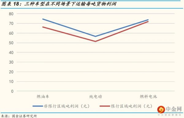 在限行區(qū)域,燃料電池物流車、燃油車和電動(dòng)物流車每噸運(yùn)輸利潤分別為71.9/66.4/51.2元。在限行區(qū)域中,燃油物流車通行證租金2500元/月,而燃料電池和電動(dòng)物流車通行證租金不到500元/月,燃料電池和電動(dòng)物流車通行證租金大幅低于燃油物流車租金,導(dǎo)致燃油物流車經(jīng)濟(jì)性低于燃料電池物流車。純電動(dòng)物流車因?yàn)檩d重小和續(xù)航低特點(diǎn),燃料成本雖然低,但是加上司機(jī)和租金成本,噸利潤依然最低。