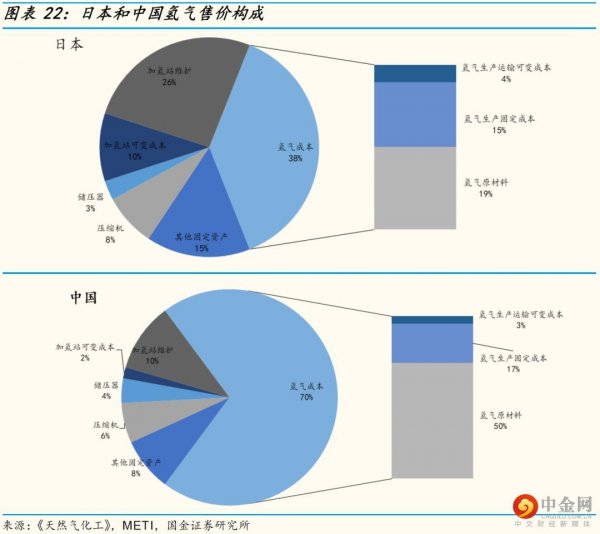 比較日本和我國的加氫站氫氣售價(jià)價(jià)格組成可以發(fā)現(xiàn),影響日本氫氣售價(jià)的最主要的兩個(gè)因素是氫氣成本(約占38%)和加氫站固定成本(約占26%),而影響我國氫氣售價(jià)最主要的因素是氫氣成本(約占70%),而氫氣成本主要包括氫氣的制取和儲(chǔ)運(yùn)。