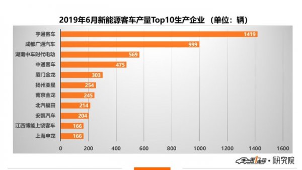 生產企業來看,2019年6月,新能源客車生產7049輛,出自48家客車生產企業,與上月相比多出11家企業。宇通客車在新能源客車領域依然保持絕對霸主地位,依然是唯一一家單月產量過千輛的新能源客車生產企業。