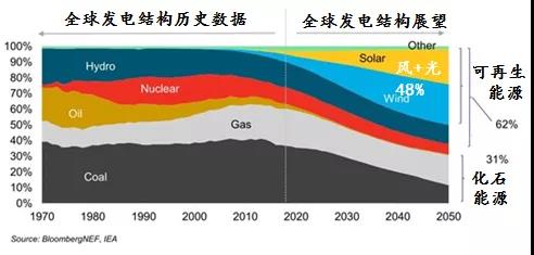 2019年7月,彭博新能源財經發布了2019-2050年全球新能源市場展望,預計到2050年,風電和光伏將占全球電力系統近一半的裝機量,并在2030年前幫助電力行業保持在控制溫升2度以內的軌道上。