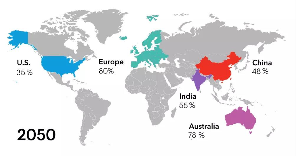 全球主要的用電和發電地區將出現不同的發電結構變化,總體來講,可再生能源(包括風電或光伏)將大幅增加,燃煤及核電將逐步減少。
