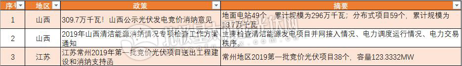 另,常州地區(qū)2019年第一批競價(jià)光伏項(xiàng)目共計(jì)38個(gè),容量123.3332MW,國網(wǎng)江蘇電力公司常州分公司對(duì)消納能力進(jìn)行了分析,最終是否具備接入和消納條件以接入系統(tǒng)評(píng)審意見為準(zhǔn)。