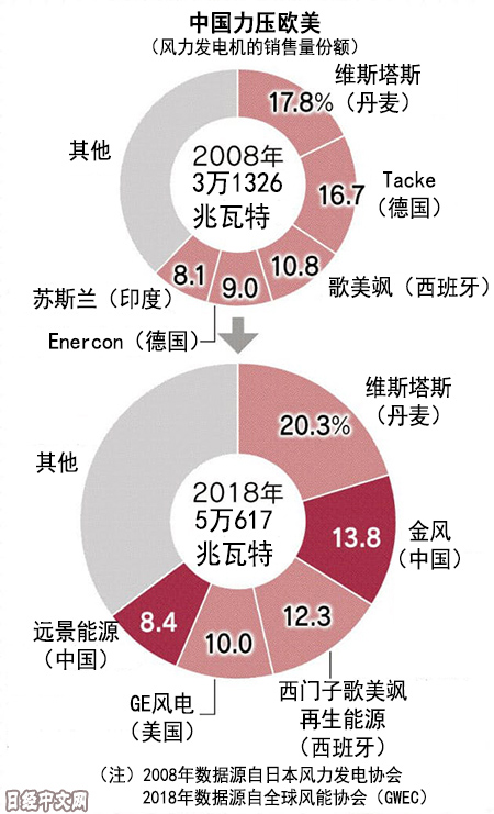 文章指出,中國企業(yè)在可再生能源領域的存在感不斷提高。國際可再生能源機構(IRENA)表示,中國在截至2018年的10年間,風力發(fā)電量擴大至22倍,光伏發(fā)電量擴大至近700倍。同一時期全球風力發(fā)電量擴大至5倍,光伏發(fā)電量擴大至33倍,中國起到了拉動作用。加上水力發(fā)電,中國在全球可再生能源領域的占比2018年達到30%,遙遙領先于排名第二的美國(10%)。