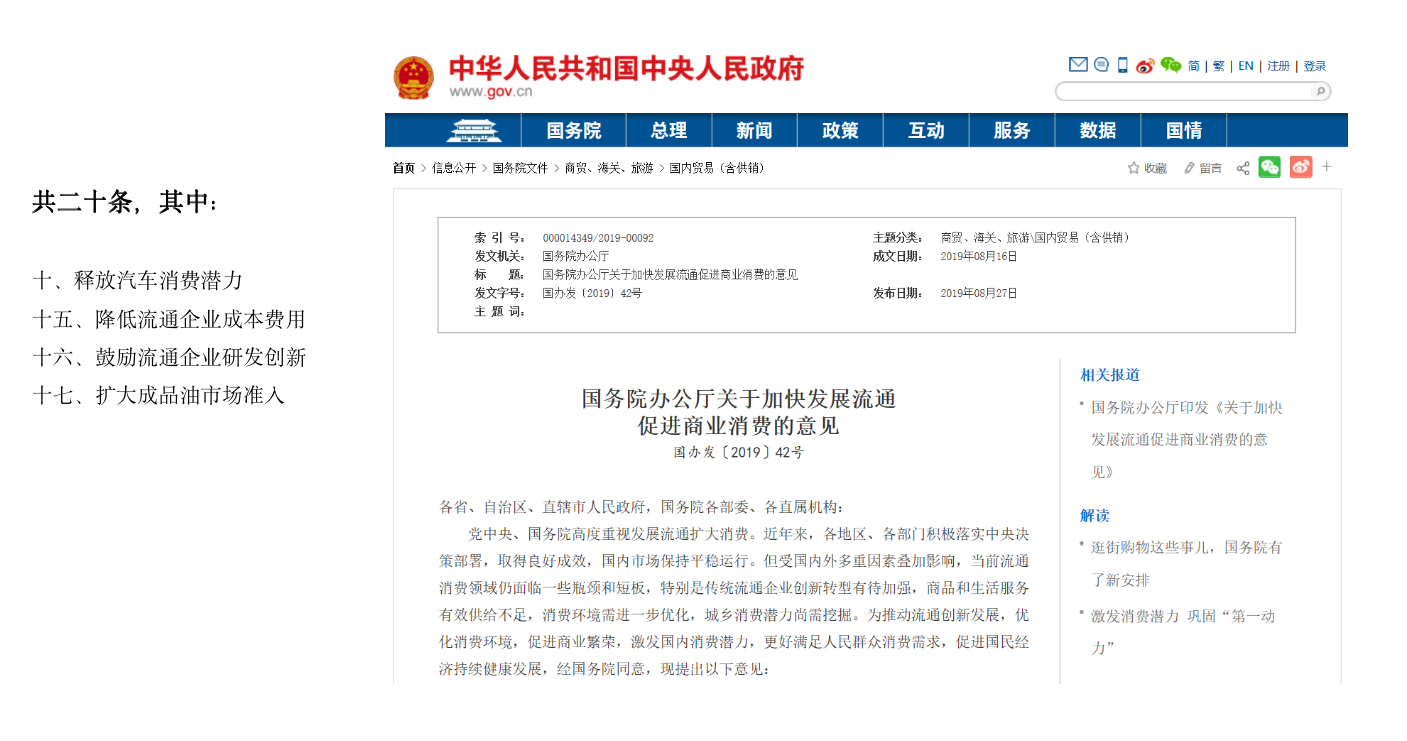 就當前的歷史節點來看,2019年8月27日,國務院辦公廳印發《關于加快發展流通促進商業消費的意見》(以下簡稱《意見》),提出了20條穩定消費預期、提振消費信心的政策措施。其中有兩條:第一個取消石油成品油批發倉儲經營資格審批;第二個將成品油零售經營資格審批下放至地市級人民政府,加強成品油流通事中事后監管,強化安全保障措施落實。這意味著能源市場進一步開放。