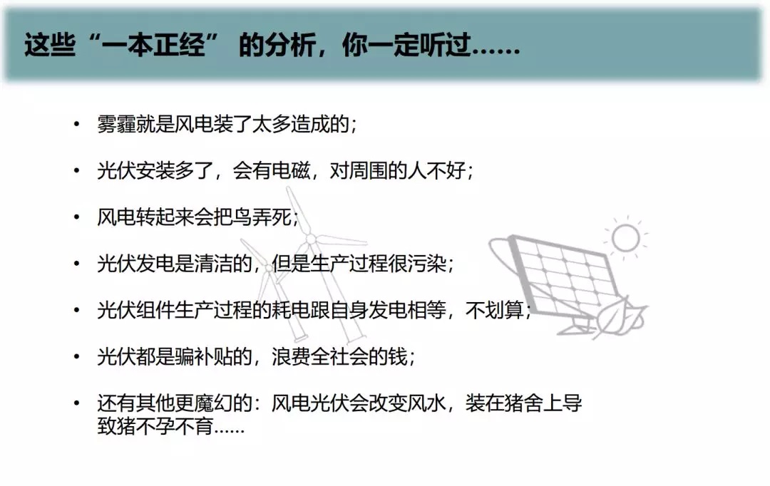“這些一本正經的分析,大家一定在過去幾年的報紙報道上看到過。比如說,北京霧霾這么嚴重,其中一個原因是風電裝太多了,阻止風進入到北京,導致北京污染物擴散的比較慢。另外,像光伏安裝后,是不是有電磁輻射,對周圍人不好?另外,光伏組件生產過程耗電跟自身發電相等,是不是不劃算?或者光伏都是騙補貼,浪費全社會的錢……這些討論現在還在微博上被很多人傳播。針對這些問題,我們在傳播領域已經跟多家機構做了很多次合作,通過各種努力辟謠,但是我們行動的速度比起謠言的傳播速度來說,差距還是很大的。