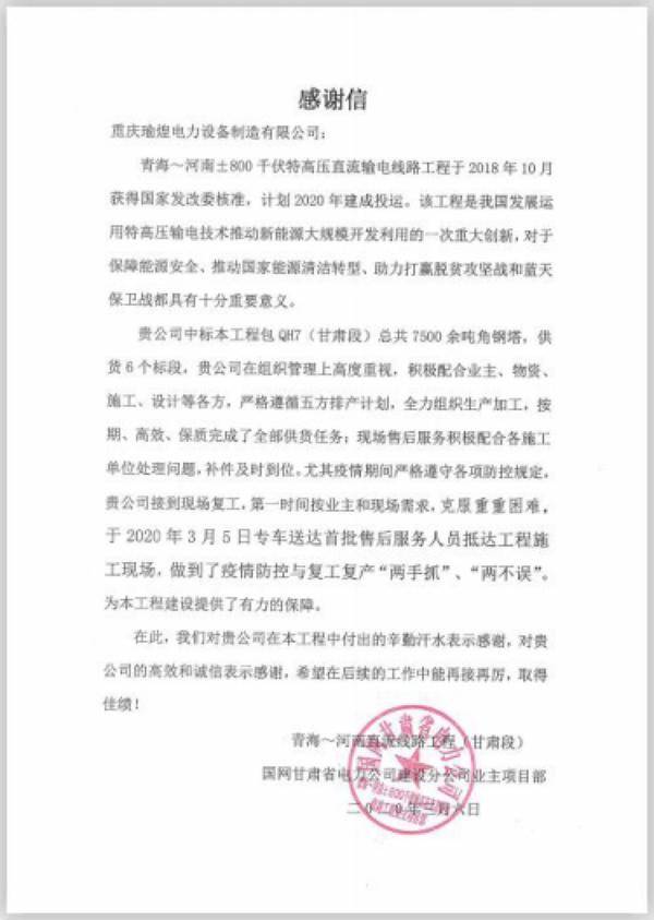 據悉,重慶順泰鐵塔制造有限公司瑜煌廠區近期收到國網甘肅省電力建設分公司業主項目部的感謝信,對重慶順泰按期、高效、保質完成青海~河南±800千伏特高壓直流輸電線路工程(甘肅段)供貨任務,并在新冠肺炎疫情期間落實疫情防控與復工復產“兩手抓”、“兩不誤”,第一時間按照業主和現場需求,克服重重困難,派專車將首批售后服務人員送往施工現場,為該工程建設提供有力保障表示感謝。