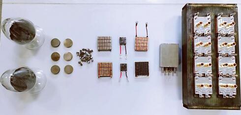 在制備車間的產品展臺上,擺放著不同形態的熱電材料、電極模塊以及熱電器件樣品。研發人員告訴記者,據行業調研和公開資料顯示,國內外熱電轉換效率普遍在8%以下,新奧科研團隊經過不懈探索,已經成功突破行業技術瓶頸,擁有了高性能材料組分的配方,掌握了相關材料及模塊的制備核心技術,獨創了熱電模塊防擴散層和穩固焊接工藝,從而具備了高性能熱電材料、模塊、器件全流程生產和檢測能力。