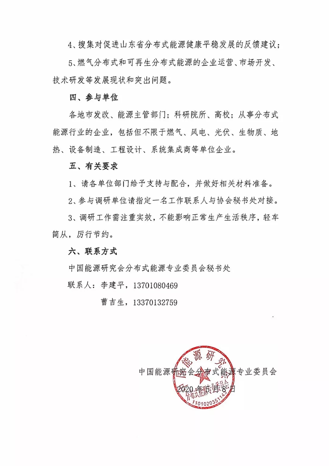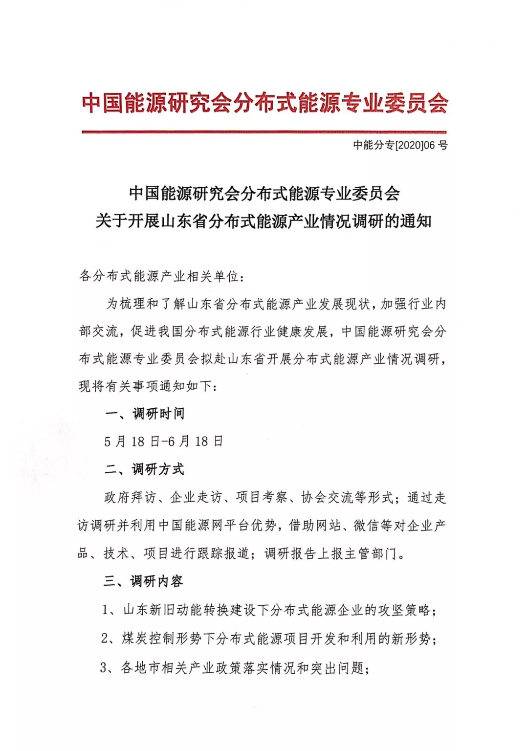 為梳理和了解山東省分布式能源產(chǎn)業(yè)發(fā)展現(xiàn)狀,加強(qiáng)行業(yè)內(nèi)部交流,促進(jìn)我國(guó)分布式能源行業(yè)健康發(fā)展,中國(guó)能源研究會(huì)分布式能源專(zhuān)業(yè)委員會(huì)擬赴山東省開(kāi)展分布式能源產(chǎn)業(yè)情況調(diào)研,現(xiàn)將有關(guān)事項(xiàng)通知如下: