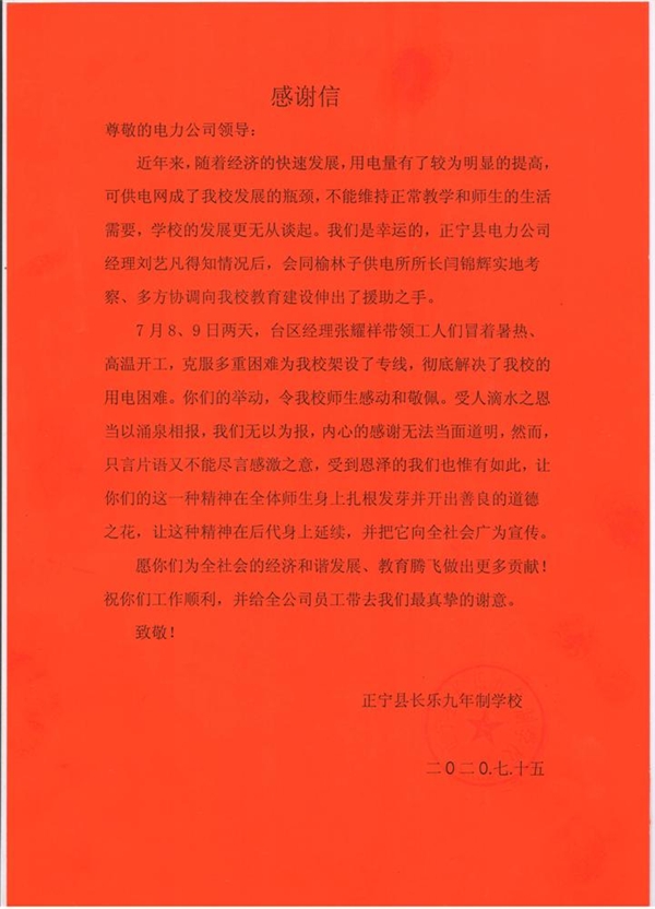 本網訊 “你公司臺區經理張耀祥帶領工人們冒著暑熱、高溫開工,克服多重困難為我校架設專線,徹底解決了我校的用電困難。你們的舉動,令我校師生感動和敬佩……”7月13日,甘肅慶陽供電公司榆林子供電所來了兩位教師模樣的人,其中一個鄭重地從文件夾取出一張大紅紙小心翼翼地貼在了服務大廳門口,頓時引來前來辦理業務的客戶和供電所值班人員圍觀,只見大紅紙上第一行赫然書寫著“感謝信”三個大字。