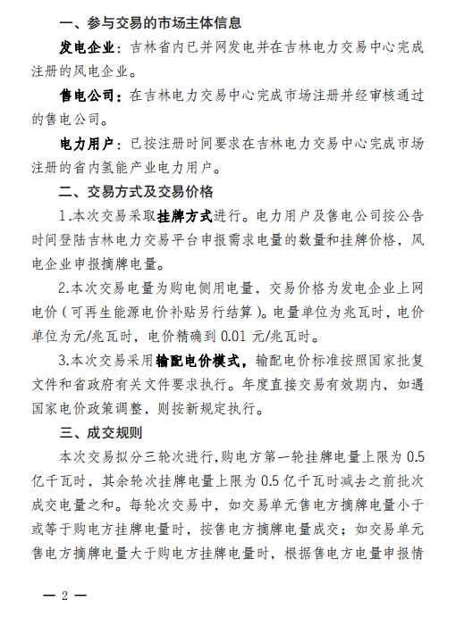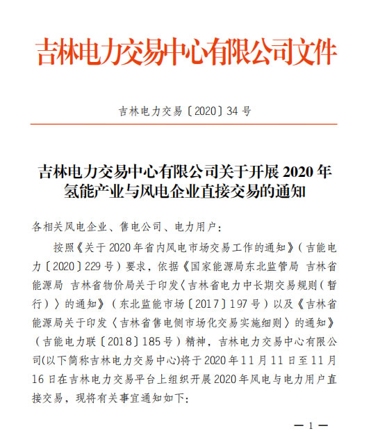 日前吉林電力交易中心發布氫能產業與風電企業直接交易的通知,11月11日進行申報。詳情如下: