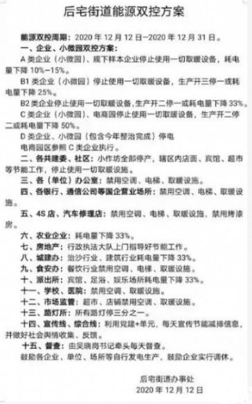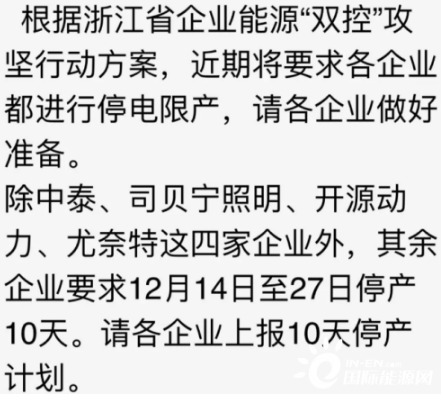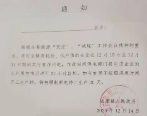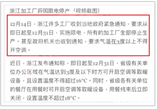 近日,浙江地區眾多工廠反應,收到了緊急通知,要求即日起至12月31日,所有加工廠全部停止生產。政府機關也收到通知,要求氣溫在3度以上不得開空調。