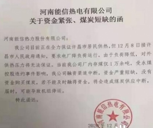 近期,河南一熱電公司發布關于資金緊張、煤炭短缺的緊急函。一份名為《河南能信熱電有限公司關于資金緊張、煤炭短缺的函》的文件在許昌市傳開。