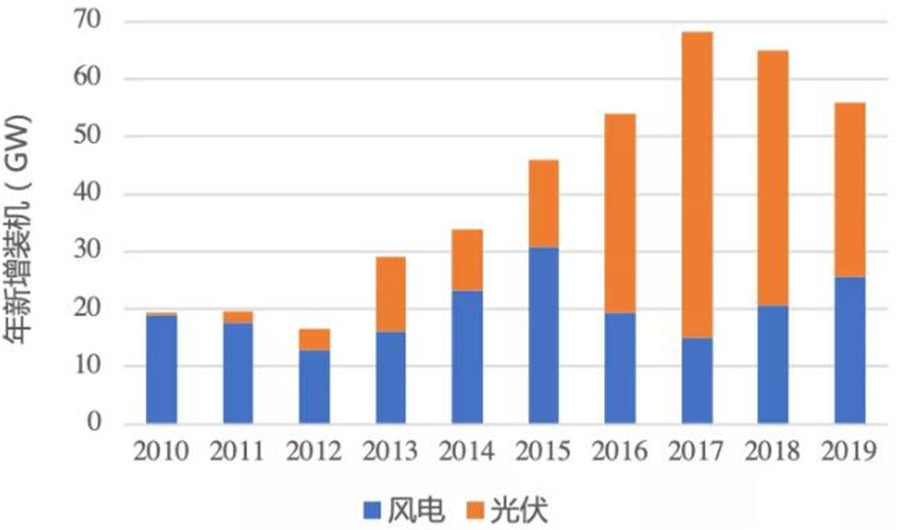 從上圖可以看出,最近十年,風電、光伏合計年新增裝機最多的三年,分別是2017年、2018年、2019年,合計年新增總規模為68GW、65GW、56GW!