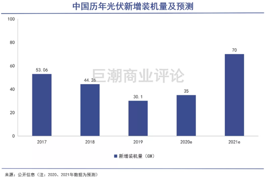 如前文所說,2019年全國新增光伏發電裝機僅有30.1GW。而據中國光伏行業年度大會透露,2020年我國光伏新增裝機量預計達35GW,有所增長。