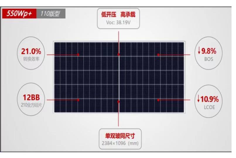 考慮硅片面積,55片210硅片大約相當于73.22片的182硅片,因此,在相同電池效率情況下,540-550W區間的產品設計,210組件的功率比182組件高1.7%,也就是大約高兩檔,也就是10W左右。同時,210的550W組件甚至比182的540W組件更窄,更利于玻璃材料選擇。