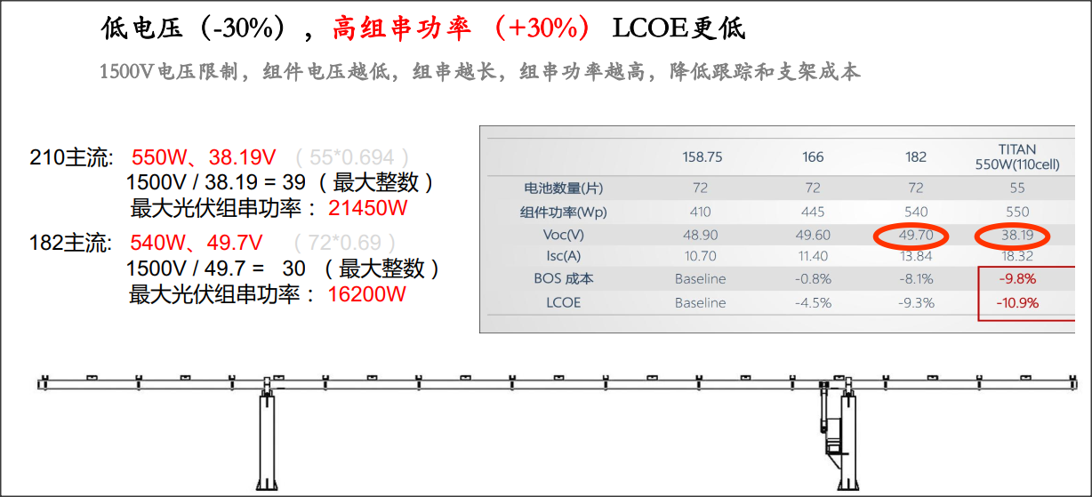 從中可以看到,210組件功率由于硅片面積大而高10W之外,在1500V的電壓限制下,組串功率最大還可以提高30%+(受支架設計影響),而作為支架解決方案上的呼應,中信博也推出了100m單軸跟蹤方案。