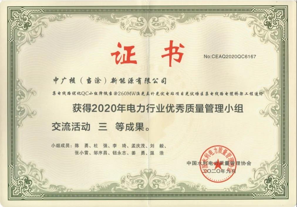 ▲中廣核新能源安徽分公司榮獲全國電力行業QC成果獎