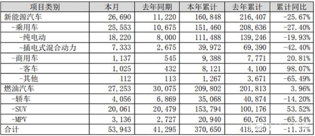 據(jù)比亞迪發(fā)布的11月銷量數(shù)據(jù)顯示,11月銷售新能源汽車26690輛,去年同期為11220輛,銷量同比實現(xiàn)翻番還多,這應(yīng)該是比亞迪今年表現(xiàn)最好的月份。但是,銷量數(shù)據(jù)同時顯示,本年累計銷量160848輛,而去年同期銷量為216407輛,累計同比銷量下滑25.67%。再細分,在乘用車、純電動、插電式混合動力、轎車、MPV等版塊,比亞迪幾乎全線下滑,僅在商用車、客車、燃油汽車以及SUV領(lǐng)域呈現(xiàn)上漲勢頭。