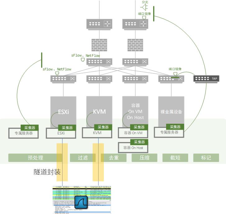 2016年起我們就開始了客戶落地。當時,客戶的訴求很直接,就是要看到虛擬網絡中的流量,其中存在的挑戰包括避免對生產環境的侵擾、保障性能的同時限制采集系統對資源的使用、能實現策略跟隨以及支持隧道分發。客戶的環境與現在還是有些區別,資源池類型主要是ESXi、XEN以及KVM,理念上也是關注全包。DeepFlow®方案的重點就是采集與分發,為客戶解決虛擬機間的東西向流量采集難題以及流量引出。需要做到避免侵擾數據面,在有限的資源使用下保障性能,在虛擬機發生遷移后,確保采集分發策略的統一及跟隨。通過隧道封裝,保時保序地將數據包分發至各類分析工具處。在這個階段,DeepFlow®實現了面向各類資源池的網絡流量“采集處理抽象層”,統一提供采集、多維過濾、去重、壓縮、截短等預處理功能。抽象層中的各類型采集器本身也是一套分布式系統,為后期面向大規模多類型的云環境監控中高性能數據處理提供基礎保障。