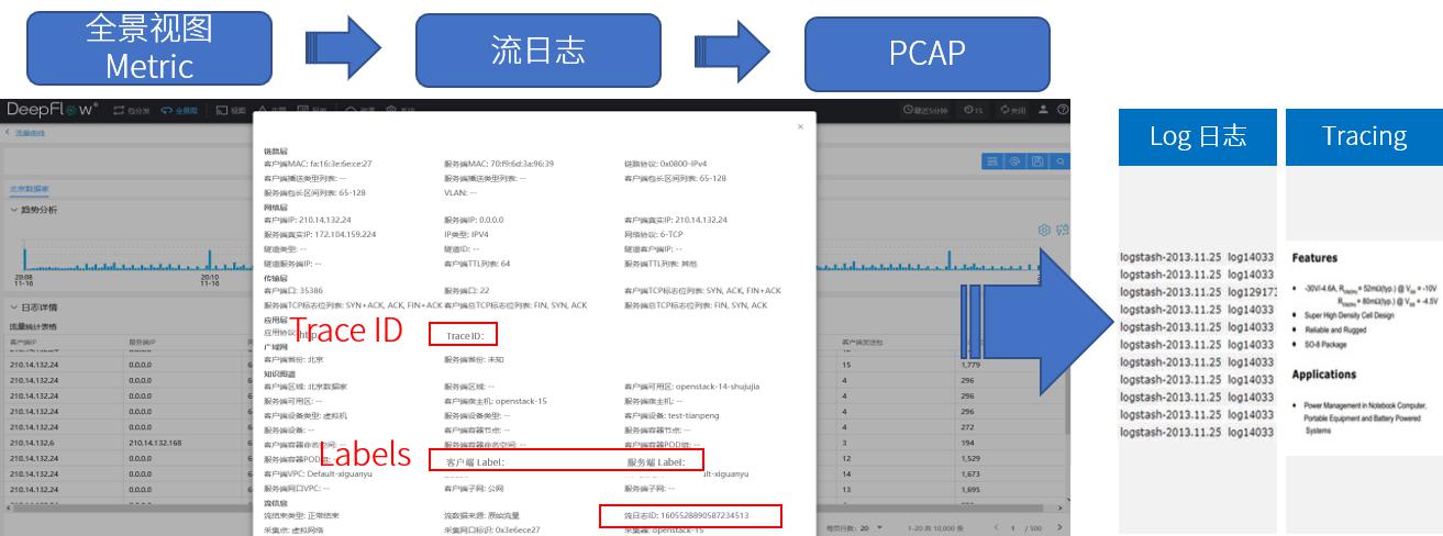 在目前階段,云杉看到客戶處容器環境發展迅猛,云建設思路更清晰,也更有規劃。同時也在體系化地考慮監控保障側的建設,將應用、網絡及基礎設施的Metric、Log、Tracing統一地加以規劃整合。此時客戶需求更多地面向業務側、更注重隨云擴展的架構實現、以及在此基礎上提供高性能數據服務的能力。比較典型的一個方案就是支撐微服務平臺的監控中心建設,通過DeepFlow®各功能展現服務依賴關系、訪問指標、網絡性能等,基于網絡流日志獲取業務Trace ID、容器Labels等鍵值,關聯Log平臺和Tracing框架,完善分布式應用系統的可觀測性。