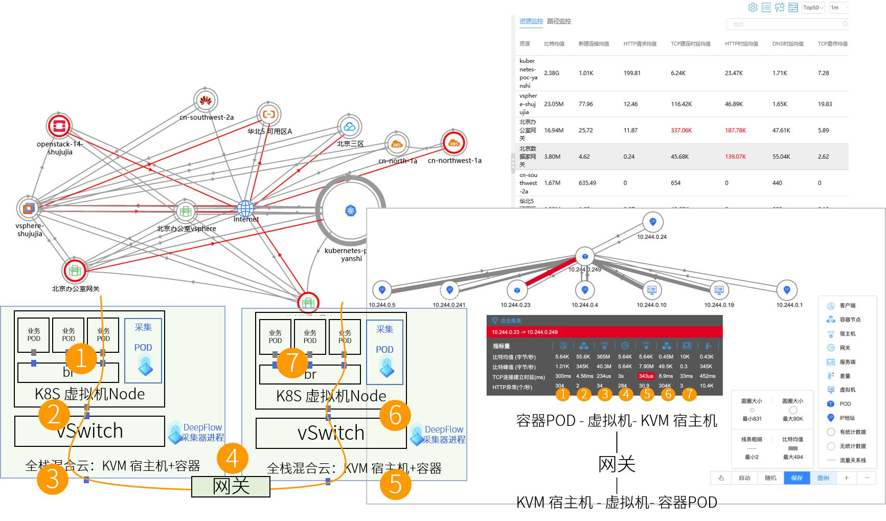 容器、虛擬機、宿主機的結合,也是常見的全棧場景,產品通過“全景圖”不同維度的查詢展示來描述各層面的關系。圖中的“點”可以是數據中心、可用區,可以是虛擬機、容器POD,可以是VPC、網段、IP,也可以是Service、資源組等。“點”與“點”之間的連線可以設置為流量、調用關系的吞吐、延時、TCP連接狀態等指標。當看到兩個容器POD的連接延時超過閾值時,客戶面臨的是一個復雜的全棧環境,涉及到POD、Bridge、vSwitch,再到東西向的Gateway,中間已進行過多次地址轉換。DeepFlow®清晰地將每一步的指標呈現出來,快速高效地定位問題點。這就是云杉為客戶提供的全棧跟蹤能力。