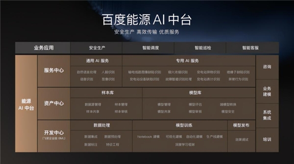 在2020百度世界大會智能云分論壇上,百度智能云能源AI中臺首次正式對外發布。能源AI中臺為能源企業智能化升級提供從方法論、平臺、服務在內的全套工具,幫助能源生產更安全,傳輸更高效,客戶服務更優質。基于能源AI中臺解決方案,能源企業可以更快速地實現上層的智能應用,快速搭建“數據+平臺+應用”的新模式,并且具備持續創新、不斷演進的自生能力。