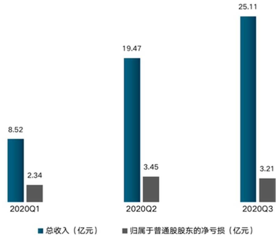 理想汽車2020Q1—2020Q3各季度總收入及歸屬于普通股股東的凈虧損 數據來源:根據公司公開資料整理