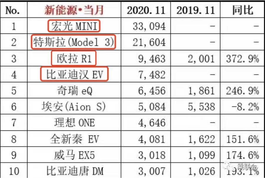 成本降低就能使得售價更低,間接使得產品性價比提升,直接結果就是銷量的增長。11月份新能源車輛銷量前四名中,除了Model 3有磷酸鐵鋰和NCA兩種版本之外,其他三個都是搭載的磷酸鐵鋰電池。