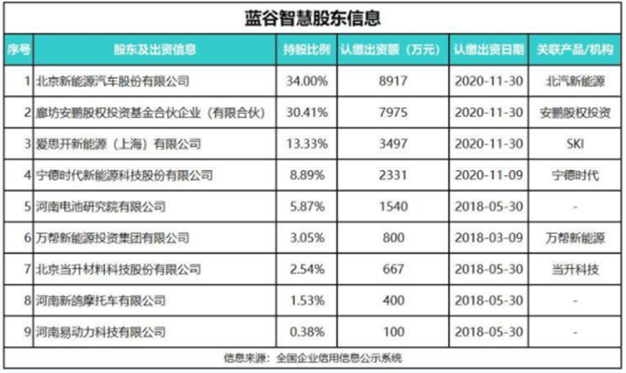 公開信息顯示,藍谷智慧目前的股東共有9位,北汽新能源持股比例最高達34%。其他幾家股東也是新能源汽車產業鏈企業,包括電池生產企業寧德時代、SKI,電動原材料企業當升科技,以及充電基礎設施企業萬幫新能源等。