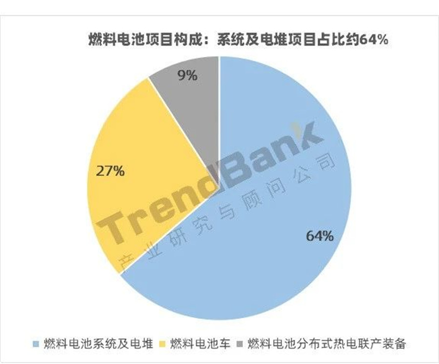 在11個燃料電池項目,燃料電池系統及電堆項目7個,占比約64%;燃料電池車項目3個,占比約27%;燃料電池分布式熱電聯產裝備項目1個。