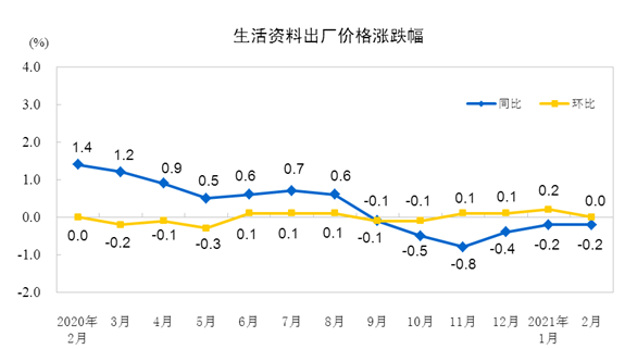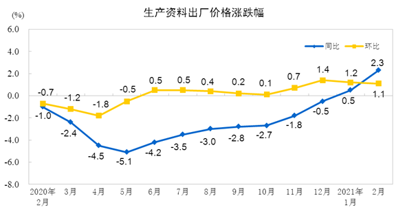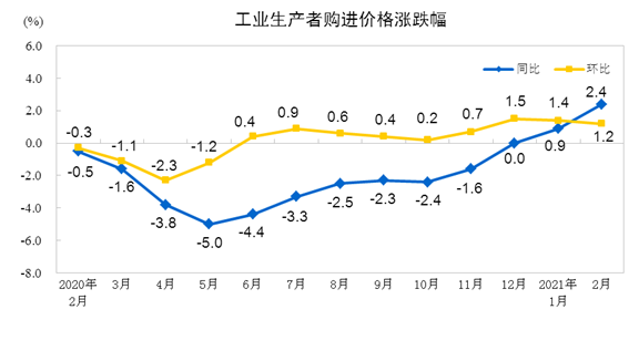 2021年2月份,全國(guó)工業(yè)生產(chǎn)者出廠價(jià)格同比上漲1.7%,環(huán)比上漲0.8%;工業(yè)生產(chǎn)者購(gòu)進(jìn)價(jià)格同比上漲2.4%,環(huán)比上漲1.2%。1—2月平均,工業(yè)生產(chǎn)者出廠價(jià)格比去年同期上漲1.0%,工業(yè)生產(chǎn)者購(gòu)進(jìn)價(jià)格上漲1.6%。