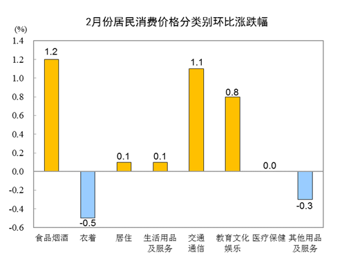 2月份,全國居民消費價格環(huán)比上漲0.6%。其中,城市上漲0.6%,農村上漲0.4%;食品價格上漲1.6%,非食品價格上漲0.4%;消費品價格上漲0.7%,服務價格上漲0.4%。