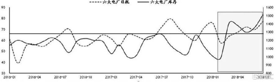 2018年年初,部分電廠庫存可用天數逼近警戒線,電廠將長江港口庫存搶購一空,但仍難抵高日耗的消耗,庫存持續下降,春節前六大電廠庫存不足900萬噸。而春節之后,電廠補庫力度遠超預期,以至于到正月十五,六大電廠動力煤庫存就站上1300萬噸的關口,甚至超出2017年備貨旺季的全年最高值。自此,六大電廠庫存就維持在1300萬噸以上。