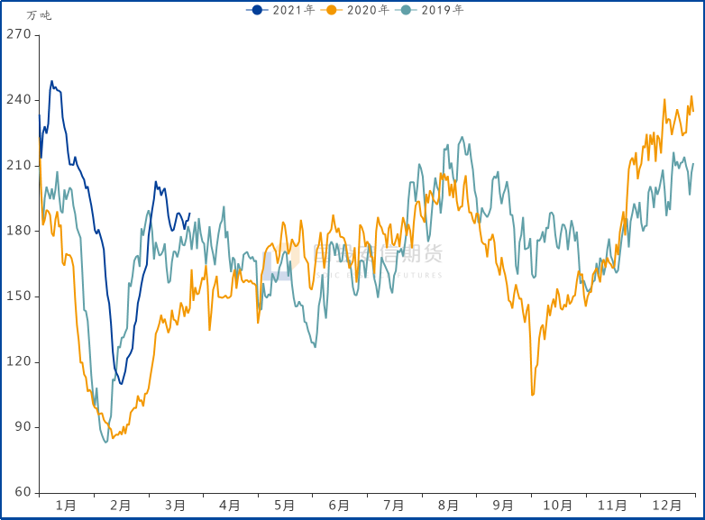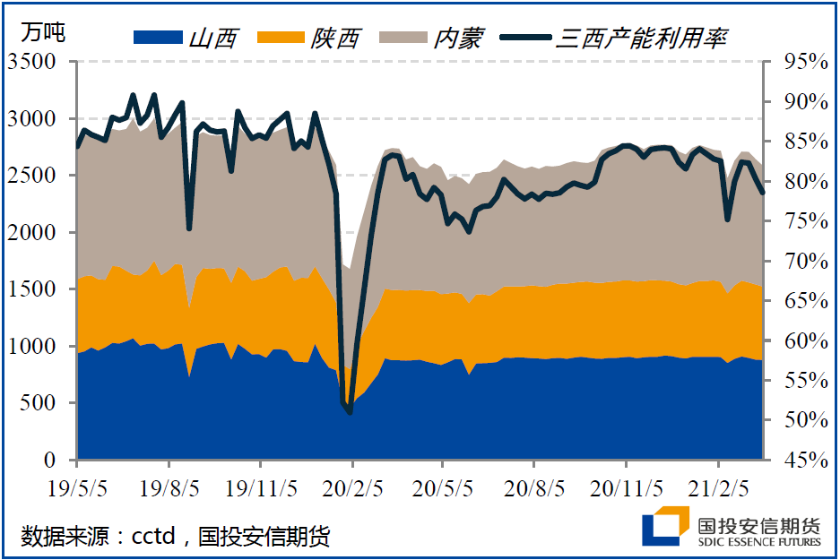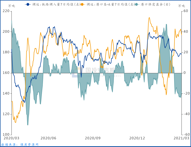 綜合考慮“原地過年”政策對春節后下游復工的積極影響,及疫情后經濟恢復驅動自建筑業向制造業和服務業傳導的輪動空間,春節前后我們反復重申對于動力煤下游需求的樂觀預期。目前來看,這一預期持續得到兌現。1-2月發電量、火電產量分別同比增19.5%、18.4%,較2019年同期水平亦增13.2%、11.4%。從3月以來的高頻數據來看,建筑業鏈條地產銷售、制造業鏈條建材及化工開工率總體表現良好,對火電耗煤及非電力耗煤均構成支撐。旬度發電量方面,今年春節偏晚的錯位影響消除后,3月上旬發電量同比增速自2月的9.7%大幅回升至19.5%,火電增速亦自8%回升至19.2%;3月以來沿海八省煤耗分別較19、20年同期水平高8.8%、11.4%,動力煤需求同比偏強。
