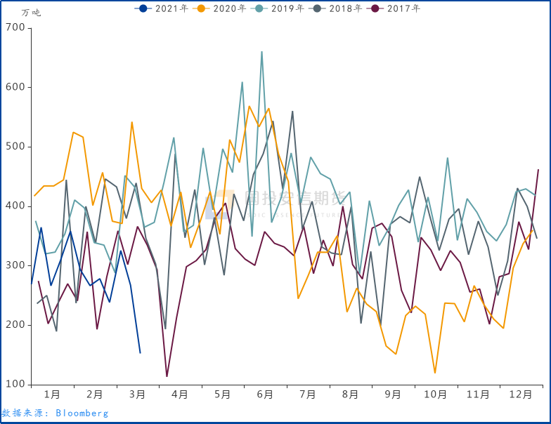 此前我們反復提到年內行情與2018年有一定相似性,春節期間煤礦的連續生產保供有效緩解了現貨市場緊張情緒、煤價高位回落,然年度總體供需偏緊格局下煤價仍將呈現高位震蕩格局。3月以來動力煤中下游庫存回落1040.3萬噸(7.1%),較去年同期水平低1461.3萬噸(9.7%)。從我們的預估來看4月末中下游庫存消費比較2月末偏緊,本輪5月合約第一輪上漲目標位650-660元/噸已經兌現,港口調入持續低位運行之下盤面價格繼續受到到港成本推動。隨著步入4月蒙西釋放新月度煤管票,坑口供應的改善有望帶動目前已超700元/噸的到港成本和期貨盤面降溫。