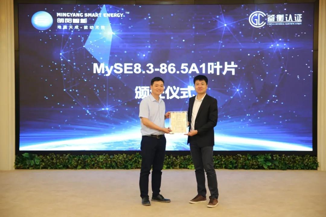 會(huì)上,鑒衡認(rèn)證風(fēng)能專家委員會(huì)為明陽智能的86.5A1葉片頒發(fā)了成果應(yīng)用證書。由此,這款葉片成為全球已量產(chǎn)最長(zhǎng)海上抗臺(tái)風(fēng)純玻纖葉片。