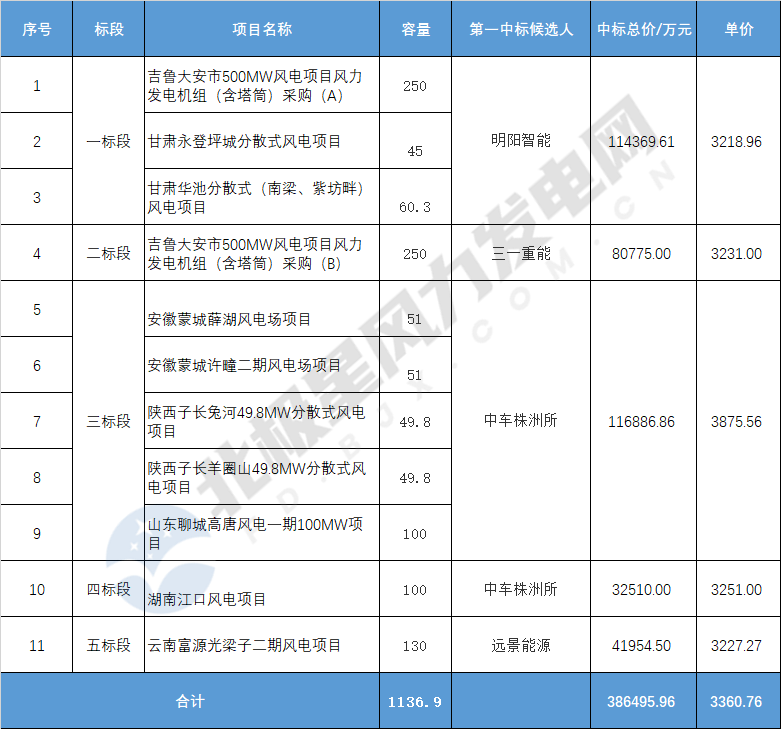 4月5日,華能集團公示華能富源光梁子二期等11個風(fēng)電項目共計1136.9MW風(fēng)力發(fā)電機組及其附屬設(shè)備(含塔筒)集中采購結(jié)果。