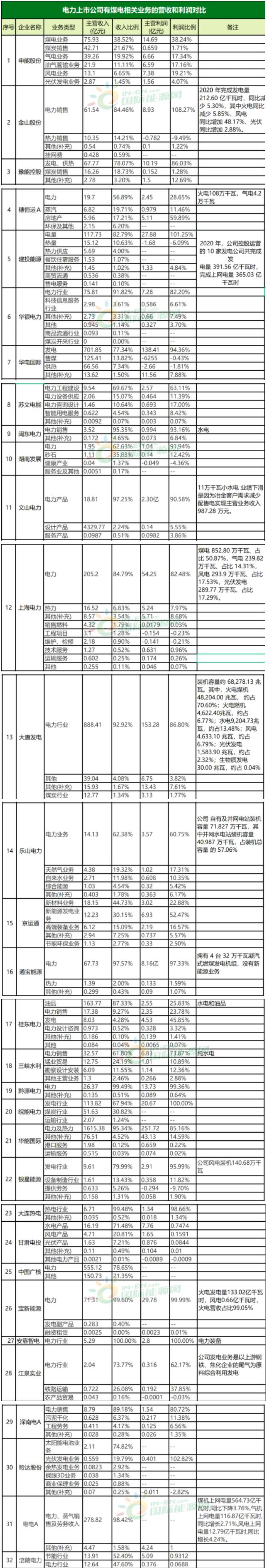 近日,各大電力上市公司2020年度財報出爐,國際能源網記者統計了32家電力上市公司的財報信息,發現各大電力上市企業整體的經營狀況都相對較好。32家電力上市公司營收出現負增長的只有13家。在歸屬凈利潤方面,僅有6家企業歸屬凈利潤出現下滑。三峽水利無論是營收還是凈利潤增幅都是最高的公司,作為發電領域堅持純水電發展模式的公司,取得如此佳績,確實非常難得。華能國際以1694億元的營收高居營收榜首,大唐發電以956.1億元的營收額緊隨其后。從營收榜前四名看,華能、大唐、華電和中廣核都是大型央企集團,其自身的發電裝機量是地方發電集團難以匹敵的。