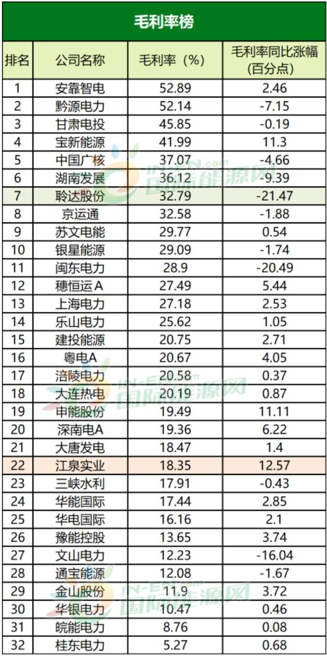 三峽水利雖然在歸屬凈利潤榜上僅僅排在第十二名,但從其同比的增速看,三峽水利的歸屬凈利潤增速是32家公司中最高的。另一家華能國際的歸屬凈利潤漲幅也非常高,這是因為公司通過研判煤炭市場走勢、優化采購策略、區域供應結構,加強與重點供應商合作的力度。節約了煤炭的成本,在供熱領域業務增幅也是讓公司歸屬凈利潤大幅增加的重要原因。