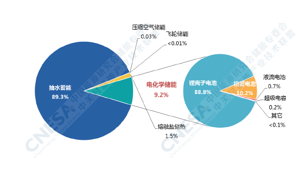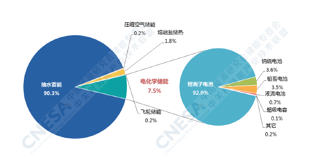 根據CNESA全球儲能項目庫的不完全統計,截至2020年底,中國已投運儲能項目累計裝機規模35.6GW,占全球市場總規模的18.6%,同比增長9.8%。其中,抽水蓄能的累計裝機規模最大,為31.79GW,同比增長4.9%;電化學儲能的累計裝機規模位列第二,為3269.2MW,同比增長91.2%;在各類電化學儲能技術中,鋰離子電池的累計裝機規模最大,為2902.4MW。