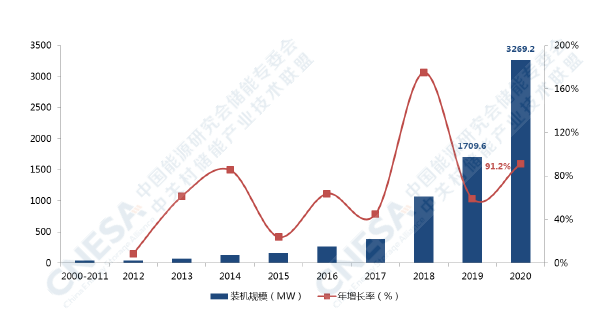 圖3:中國儲能市場累計裝機規模(2000-2020)