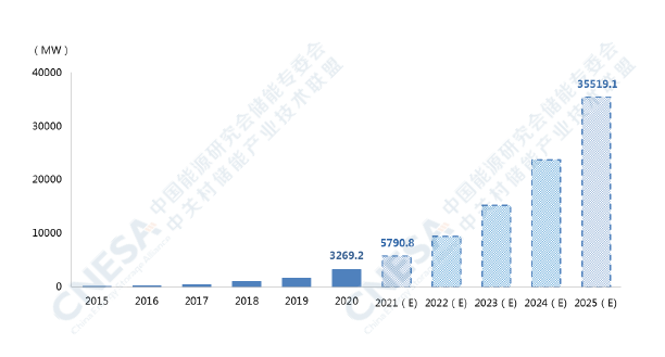 本版白皮書分別基于保守和理想兩種場景對2021-2025年中國電化學儲能市場的規模和發展趨勢進行了預測。