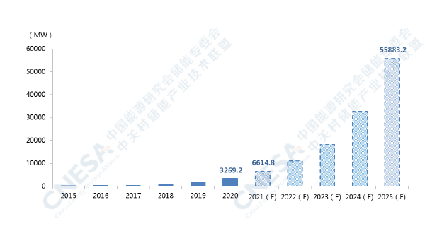 圖6:中國電化學儲能累計投運規模預測(理想場景,2021-2025)