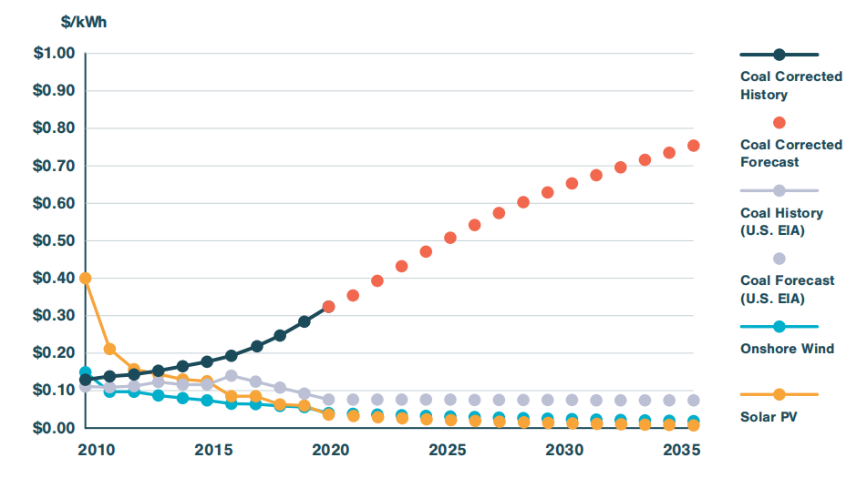 塞巴說,“新的太陽能或風力發電裝置的總成本已經低于天然氣、煤炭和核能等傳統發電的運營成本。意味著,即使建造傳統的發電裝置不需要任何成本,但僅從運營成本來看,仍然比太陽能或風力發電裝置昂貴。” “然而,不現實但很容易糾正電力的平準化成本可能繼續推動對傳統電力的投資。一旦錯誤的LCOE成本和實際的平準化成本之間的差異變得無法否認,金融市場將迅速發展,養老金、退休和捐贈基金的數萬億投資可能變得一文不值。這方面的一個例子就是,美國煤碳(股票等的)市值中所反映的美國道瓊斯美國煤炭指數,坍塌99%,從2011年的高點500跌到2020年的5,此時該指數本身被標準普爾全球悄然停止。