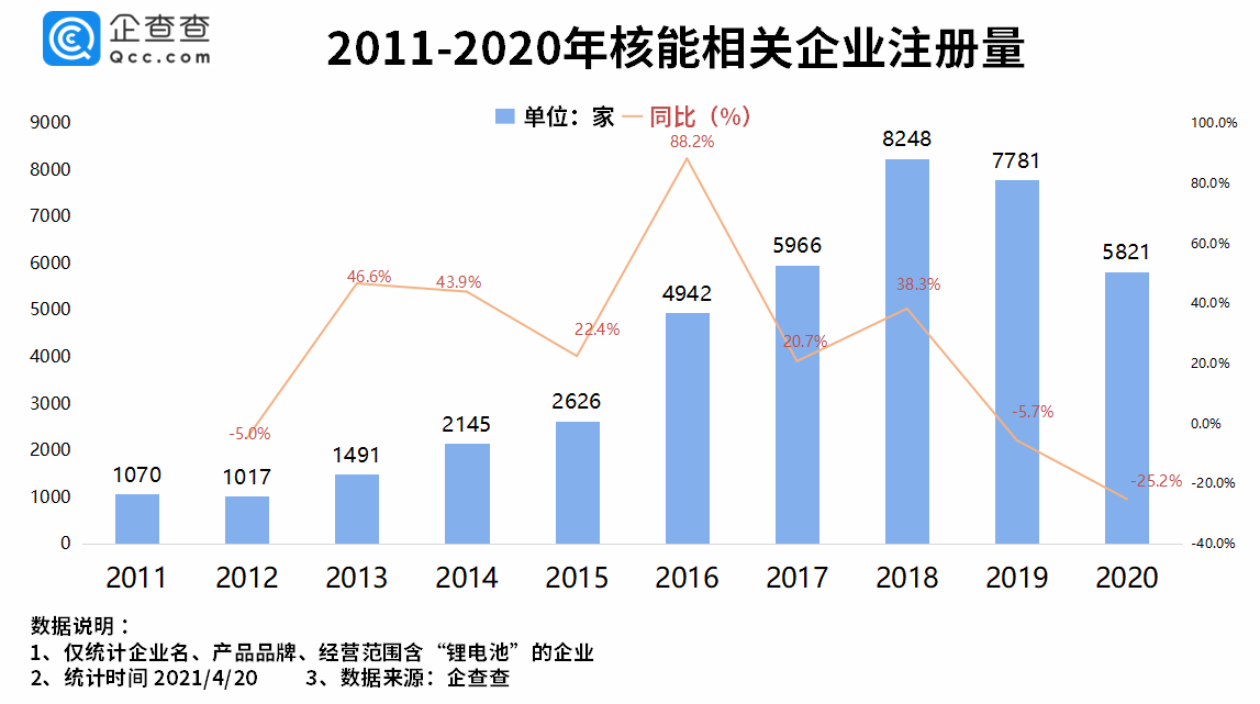 從近十年來鋰電池相關企業年注冊量變化來看,企查查數據顯示,2018年之前均處于逐年上升趨勢,2018年達到最高的8248家,2018-2020年呈逐年下降趨勢,2020年全年新注冊企業5821家,同比下降25.2%。